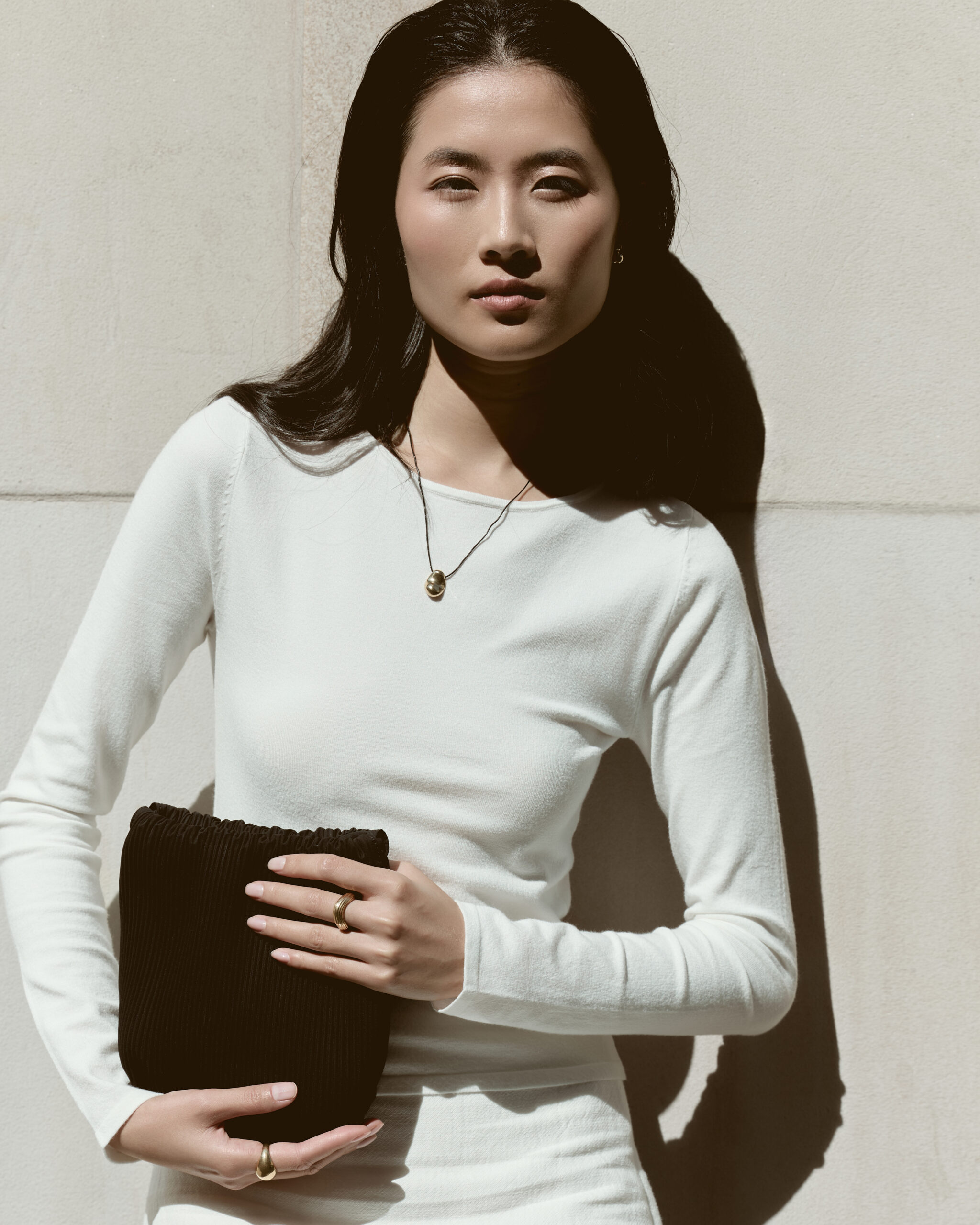 This pendant is crafted from 18k gold-plated .925 sterling silver, with a softly shimmering surface reminiscent of a calm sea. The pendant comes with a 90cm leather cord, allowing for a variety of wearing options, depending on how you tie the knot. The pendant measures 18 x 12 mm. The brand’s logo is on the reverse.