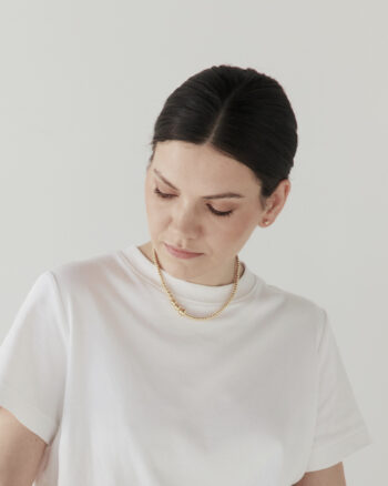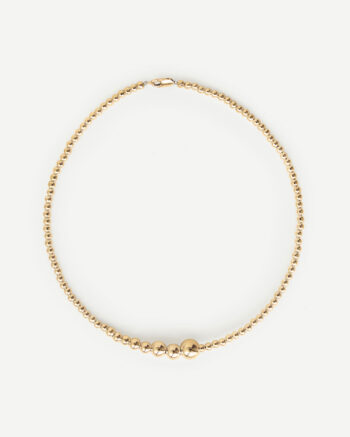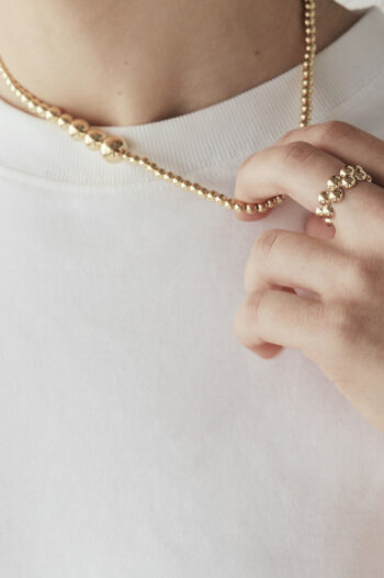 Naszyjnik z pozłacanego 18-karatowym złotem srebra próby 925 o długości 40 cm. Zmniejszający się ciąg kulek jest inspirowany wiszącymi na krzaczku porzeczkami. Z uwagi na ręczne wykonanie naszyjnika, długość całkowita może wahać się o +/- 5 mm.