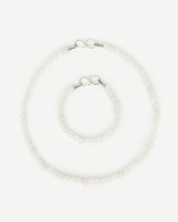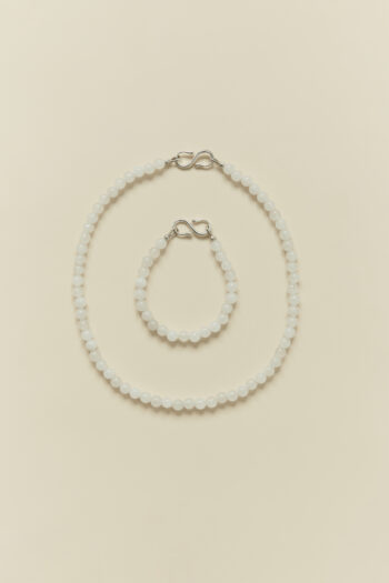 Zestaw naszyjnika oraz bransoletki Alba. Ich główny element stanowi niezwykły naturalny kamień szlachetny – biały jadeit – zakończony jest autorskim zapięciem ze srebra próby 925. Jego plastyczne końce można delikatnie doginać, dzięki czemu samodzielne zapinanie naszyjnika jest niezwykle proste. Łączna długość naszyjnika to 41 cm a bransoletki 19 cm. Ze względu na naturalny charakter kamieni, produkty mogą nieznacznie różnić się od siebie a długość może wahać się o +/- 5 mm.